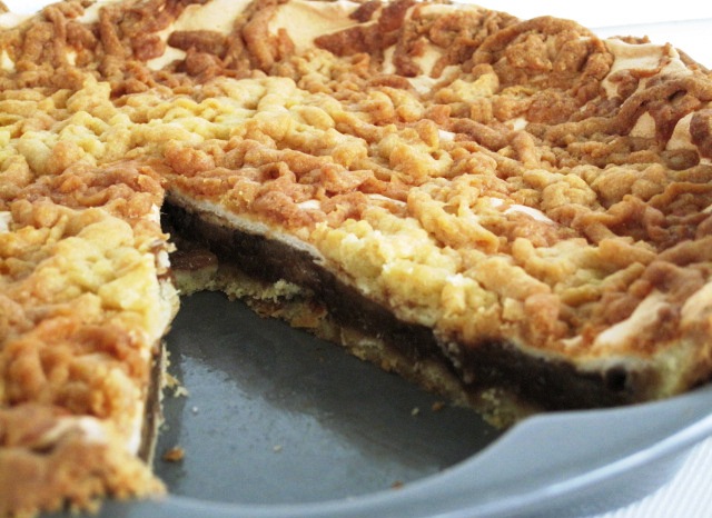 The meringue topping, sprinkled with shredded dough, gives it a nice finishing touch.