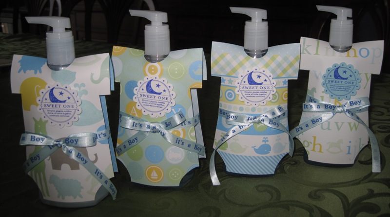 Also, bottles of hand soap, dressed up in Onesies. My daughter is very much into stamping and scrap-booking, so all her tools and ideas helped out tremendously, as well as her time. She’ll make a great aunt!