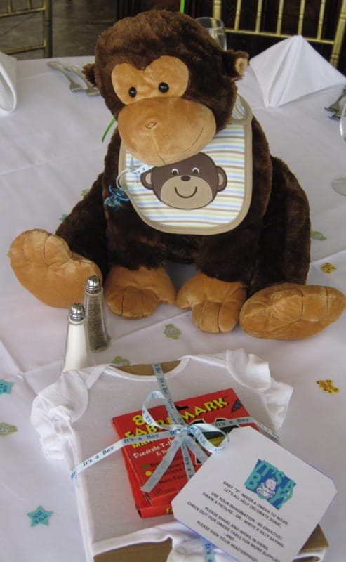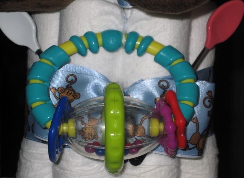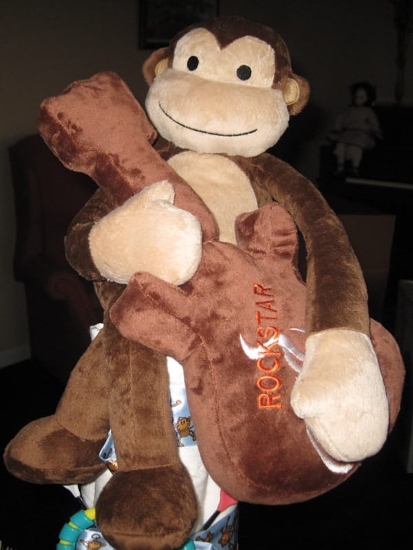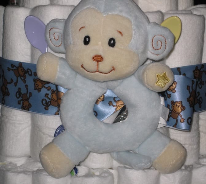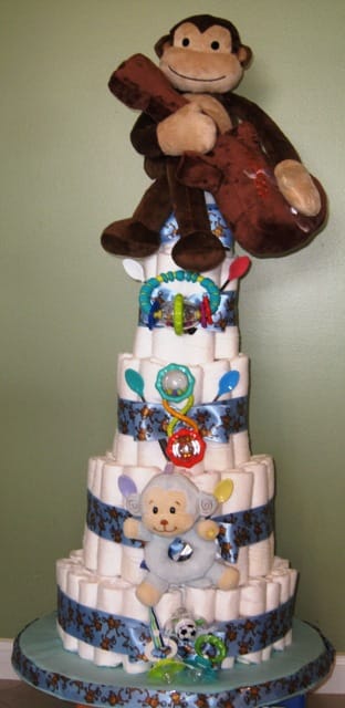 I created a Diaper Cake, out of 150 Pampers diapers, plus some small baby items. To express the theme of the baby’s room decor accents, I used a plush monkey paying a guitar, as the cake topper.