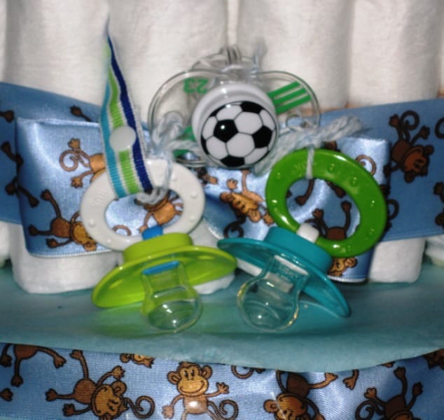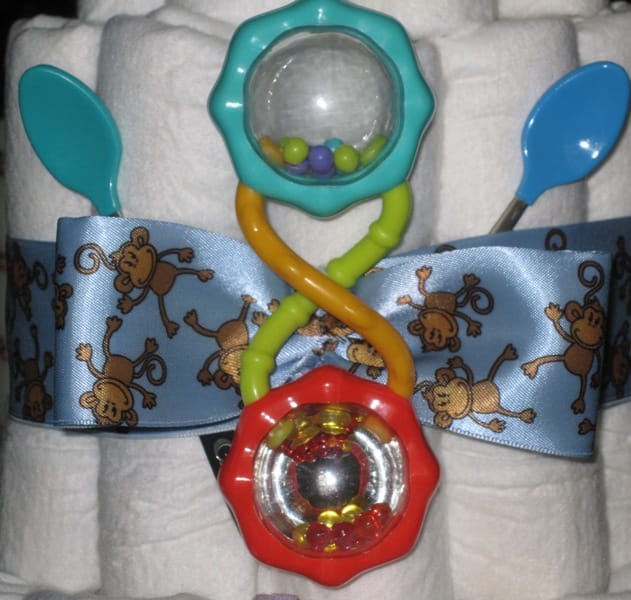 Here are the close up pictures of the different decorations on each layer of the Diaper Cake: