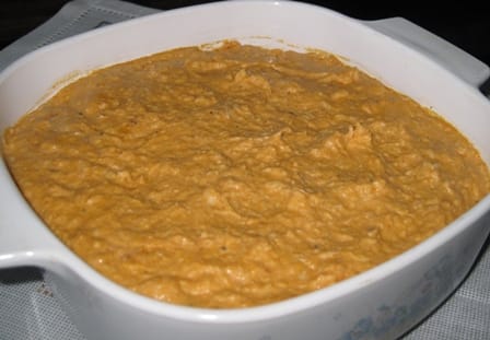 - Scoop mixture into a casserole dish, and smooth the top with a spoon to even it out.