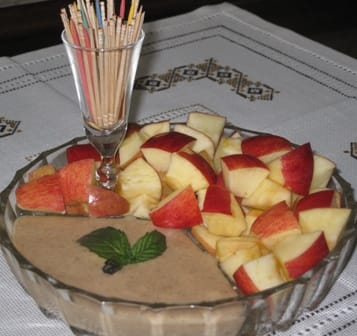 - Place the bowl of dip on a platter, and arrange apple pieces around it.