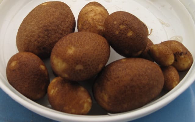 These are baking potatoes, so the skin is darker and thicker than the Red Potatoes. Since these are a product from only potato peels, they are much smaller. The larger ones are the size of an egg, and the smallest ones are the size of a grape.