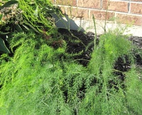 This year she has another surprise plant in her flower patch. At first we were not sure ourselves what it was, and almost pulled it during weeding, but now it turned out to be an asparagus plant.