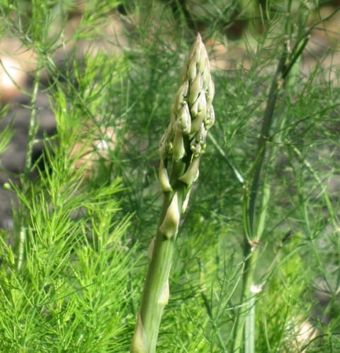 Here is a close up of the actual asparagus stalk , which as you can see, grows separately from the fern leaves, yet from the same plant root system.