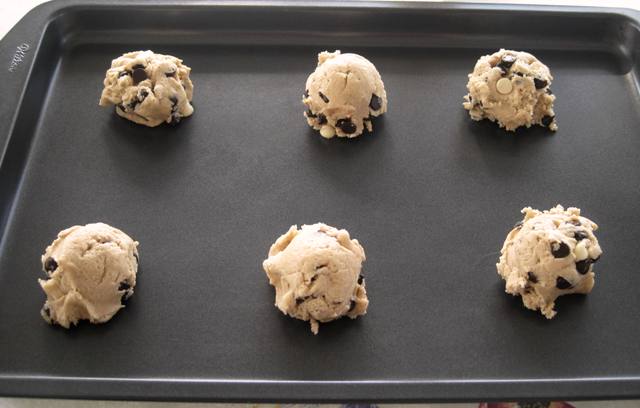 - Drop 1/4 cupfuls of dough (I used ice cream scoop) onto ungreased cookie sheet, spacing them about 2 inches apart. Each mound is about 2 1/2 inches in diameter, but expands to 4 1/2 inches, or more, during baking.