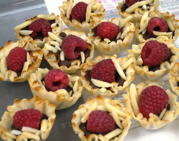 This month we “gently” indulged in a low sugar Chocolate Rum Cake, which was out of this world, and low sugar/fat Phyllo Pastry Shells partially filled with melted Dark Chocolate, topped off with a fresh raspberry, and for added touch and nutrition, sprinkled with almonds.