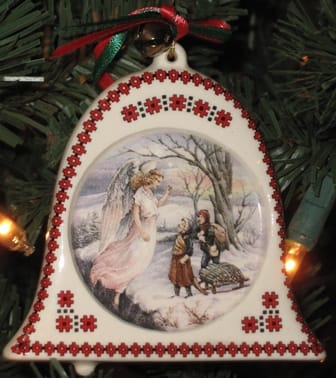 This is a Ukrainian design ceramic bell-shaped ornament, with a painted picture of a Guardian Angel, protecting small children going sledding. There actually is a special prayer for children to their Guardian Angel, and my little granddaughter is learning it already.