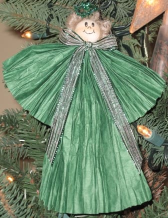 A very nice young lady I knew in upstate NY made this angel. I purchased it at a church bazaar. It is made of a wooden ball, crinkle paper, and some ribbon.