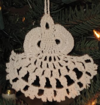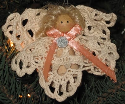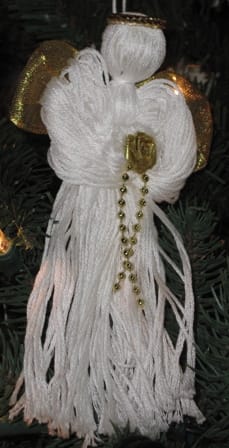 This angel is made mostly out of white embroidery floss and some ribbon. I also purchased this one at a church bazaar.