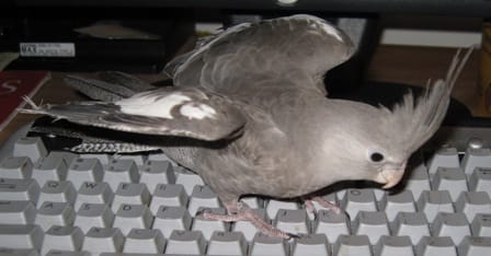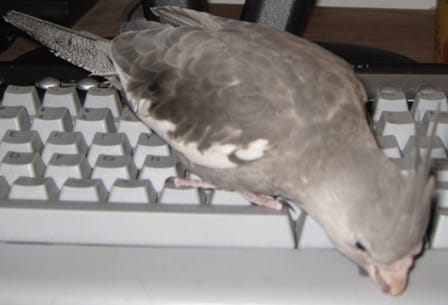 This weekend I had a very special guest at my house, who watched me work on my next post for my blog. After sitting there patiently, as not to interrupt my train of thought, he decided to help out….after all…isn’t that what friends are for? As he was hard at work, I decided to chip in by taking a few pictures of this event, and sharing them with you. By the way, his name is Kiwi, and besides being a diligent writer, he is a devout singer.