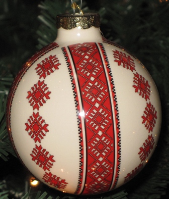 This is my very special ornament, a contemporary version of a hand-painted image of the Virgin Mary, dressed in a Ukrainian traditional attire, holding baby Jesus, wrapped in an embroidered cloth.