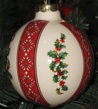 This ornament incorporates some of the traditional Christmas motifs, hence the hand-painted Holly leaves and berries.