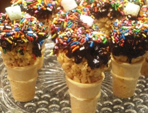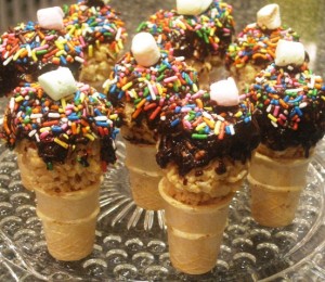 Since she loves assisting her mom, and grandma, in the kitchen, making the rice krispies was a lot of fun for her. Her favorite part was dipping the cones in sprinkles…..lots of sprinkles, as you can see.