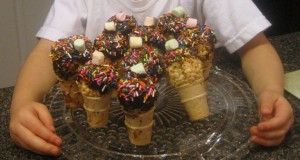 Then we melted some chocolate chips to use for dipping the rice krispies “ice cream” tops into. Next, we dipped the still wet chocolate cone tops into colorful sprinkles. Topped off each “ice cream cone” with a miniature marshmellow dabbed in chocolate, to help it stick better.