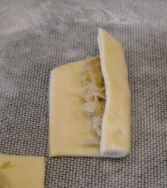 - To close up the filling into the pyrizhky, fold over one side of the longer end of the dough piece, pushing the filling under, and keep on rolling to the other end, overlapping it. Before final overlapping, moisten the other edge of dough with a drop of water, to form a better seal.