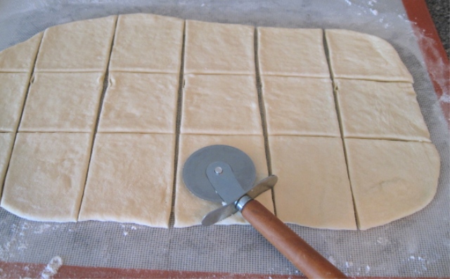 - Using a pizza cutter, or a knife, cut into 2 x 3 inch rectangular pieces.