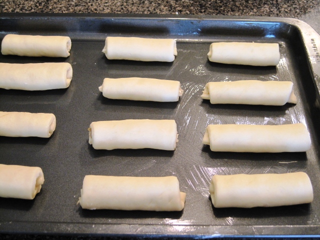 Grease a cookie sheet before placing the rolled pyrizhky on it.