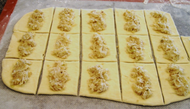 - Spread a teaspoon of filling in the center of each rectangular piece.