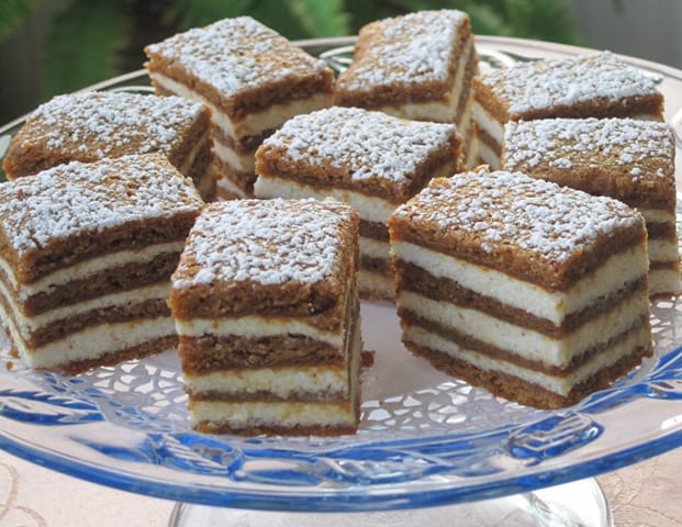 This sheet cake starts off on a crisp side right after baking, but once layered with the filling, it begins to soften up. It is very important to keep the filling refrigerated until ready to use. Also, once all the layers are completed, the “torte” needs to be fully wrapped in foil paper, and stored in the refrigerator until serving time, to prevent melting down of the filling, and saturating the cake layers with moisture (see TIP, for important suggestions).