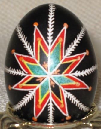 Step 12 – Make a small hole at the tip of the egg (you can use a skinny drill), and expel the egg fluids out of it. Stand it on the egg dryer rack once more, with the hole down, so that any leftover fluids can drip out. Once you have successfully completed all the steps, your plain white egg magically transforms into a beautiful Pysanka. Now you are ready to start another one…..believe me, you will not stop after just one…..you will be hooked on this craft, challenging yourself each time to a more intricate design.