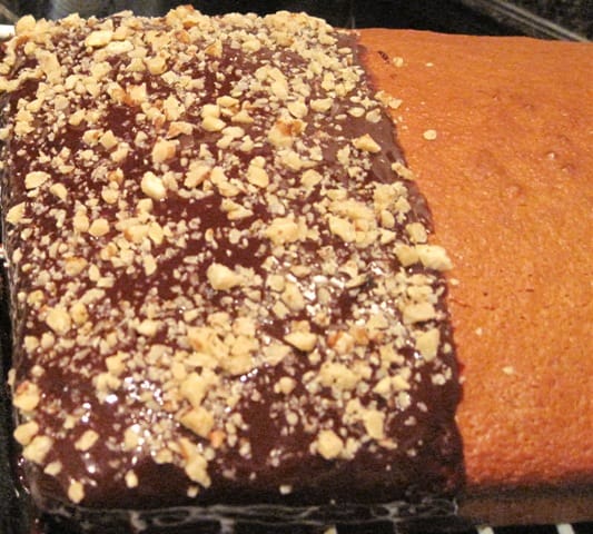 One-third of the honey cake is iced with chocolate ganache and walnuts, the second part will remain plain, and the third part will also be iced with chocolate ganache.