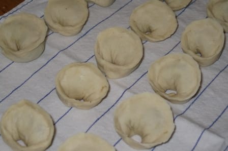 To make vushka, you may follow my varenyky (pierogi) recipe for the dough, but cut the recipe in half, and use a much smaller cutter (2 inches in diameter – a shot glass is perfect for this). Once you seal in the filling, then wrap the varenyky around your index finger, and pinch the ends together, to form a vushko (ear-like shape).