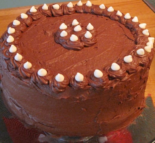 - Place the last caked disk on top, and spread the remaining mocha frosting on top and sides of the torte.