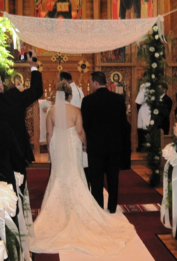 In the Byzantine Rite, the exchange of rings takes place during the Betrothal, as followed at this wedding. The rings symbolize God’s union with the marrying couple, an unbroken circle representing a pure and eternal union. The Priest is the one to first place the rings on the hands of the Groom and Bride. The Priest only slides the ring halfway down the hand, so the Groom and Bride may affirm their commitment to each other by completing the placement of the ring. Once exchanged, the rings serve as a visible symbol of the endless love and union that exists between husband and wife, and God. The rings further remind the couple that in married life, the weakness of one partner will be compensated by the strength of the other, that by themselves the newly betrothed are incomplete, but together, and with the blessing of God, they compliment each other, and are complete.