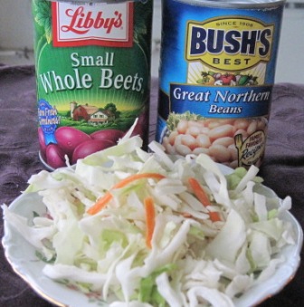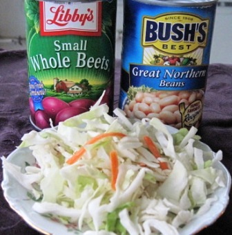 Three main ingredients, all ready to use; Whole Red Beets, White Beans, and pre-cut Coleslaw cabbage.