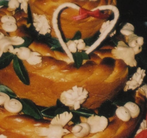 The Greeting Bread is basically the same recipe as the Easter Paska Bread, except that it has an indentation in the middle, for a small container of salt, accompanied by wine, which is used by the parents to greet the newlyweds, as they enter the reception hall.  The parents, and the bride and groom, partake of the Greeting Bread dipped in salt, which symbolizes the bitter moments of life, followed by a sip of wine, which symbolizes the sweet moments in their married life.  This also is a time when both families unite as one and welcome the newlywed and their families into their family circle.