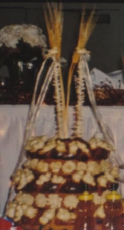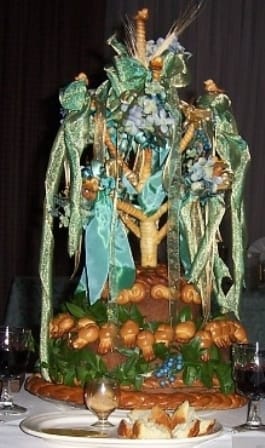 The Korovai is an elaborately decorated multi-tier bread, which is not consumed (at least in the US), but rather as a decoration and a gift from the parents to the newlyweds. This bread symbolizes community and the circle of life. One of the most prominent embellishments on the Korovai is very intricately formed dough doves and other birds, which symbolize the married couple, their family and friends, and fertility. Wishing the bride and groom future family growth and healthy children. The bread are surrounded by a wreath, or leaves, of fresh periwinkle, symbolizing love and purity. (Periwinkle wreaths are also placed on the head of the Bride and Groom, during the blessing part of the matrimonial ceremony, at the church).