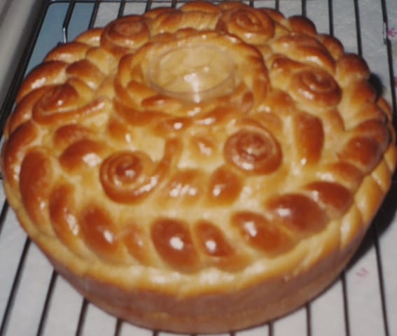 The Greeting Bread is basically the same recipe as the Easter Paska Bread, except that it has an indentation in the middle, for a small container of salt, accompanied by wine, which is used by the parents to greet the newlyweds, as they enter the reception hall. The parents, and the bride and groom, partake of the Greeting Bread dipped in salt, which symbolizes the bitter moments of life, followed by a sip of wine, which symbolizes the sweet moments in their married life. This also is a time when both families unite as one and welcome the newlywed and their families into their family circle.