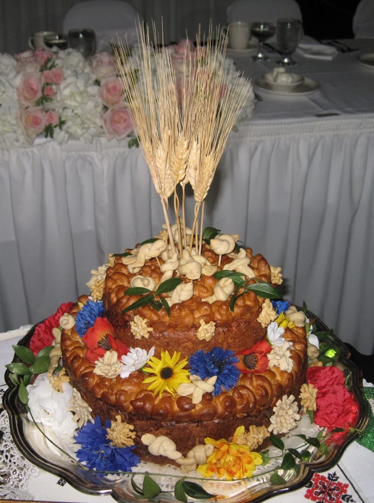 The Korovai was beautifully decorated with numerous love birds, periwinkle, native flowers and wheat stalks.