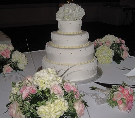 Very elegantly displayed wedding cake, surrounded by bouquets of flowers, the Bride’s “throw away bouquet”, and a special knife set for the bride and groom to use during the cake cutting ceremony.