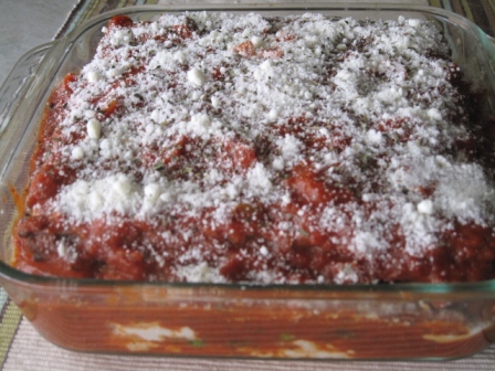 Sprinkle the remaining Parmesan Cheese over the top of the lasagna.