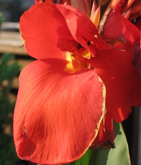 This Red Canna Lily plant, and about 6 more of these throughout my flower patch, were given to me by my husband’s aunt, who loves tending to her flower and vegetable garden, and the fruits of her labor are definitely showing in her garden. The tubers of these plants needed to be kept in a dry cool place (my basement) during winter, and I planted then in my garden in mid April. These Lilies do not have much of a fragrance, but they have such luscious foliage, and a very interesting way to display their flowers.