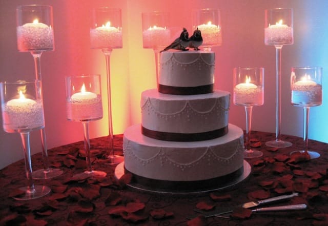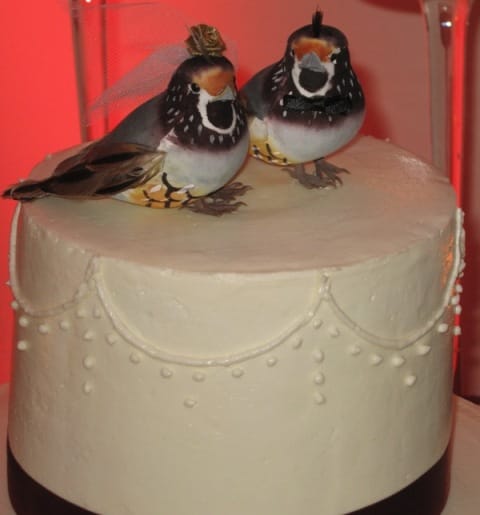 Here is a very elegant Wedding Cake display, with the two tiered candles in the background. Also, a close up view of the love birds, as the cake topper (notice the tiny veil on one of the birds).