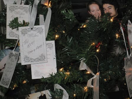 There was a Christmas Tree set up near the entry to the Reception Hall, decorated with various photos of the Bride and Groom, and their families and friends. On the table next to the tree, were family wedding photos of their parents and grandparents, as well as a stack of wish cards for guests to fill out and hang on the Christmas Tree. This was such a wonderful idea, replacing the usual signing of a guest book.