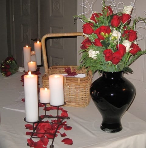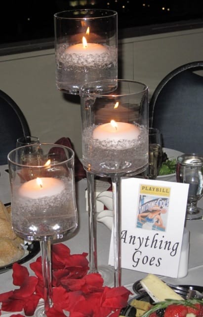 As you can see, the theme was candles and rose pedals, which adorned all the display tables. The dinner tables had three tier crystal candle holders with floating candles, rose petals, and each table was named after a famous play name, rather than being numbered (mine was “Anything Goes”). The guests found their seating by locating a play admission ticket with their name on it, and the play name of their table. The idea was very appropriate for this Bride and Groom, as they both were very active in play acting during their High School and College years, and the Groom is pursuing an entertainment career.